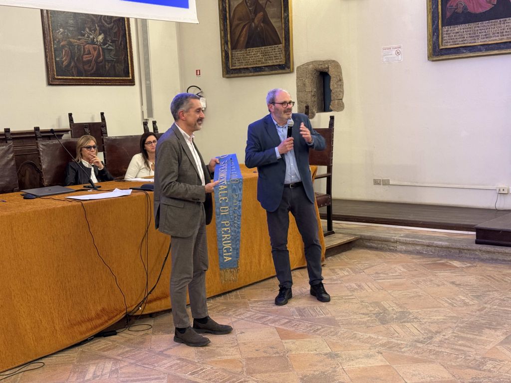 "Il Direttore uscente, prof. Gaetano Martino, consegna il nastro dell'Istituto Regio Superiore per l'Agricoltura di Perugia, al nuovo DIrettore di Dipartimento, prof. Antonio Boggia"